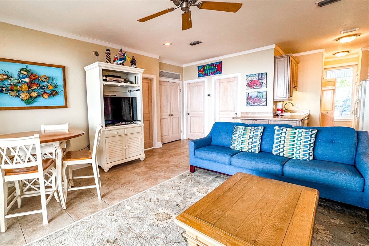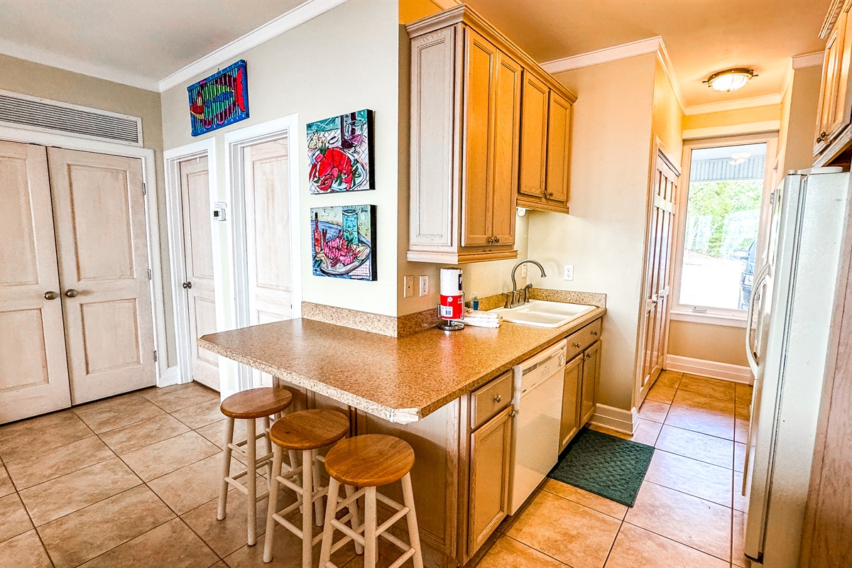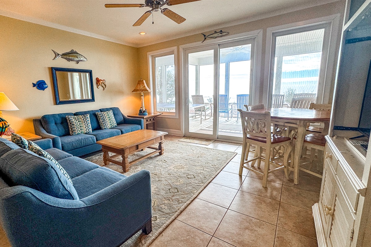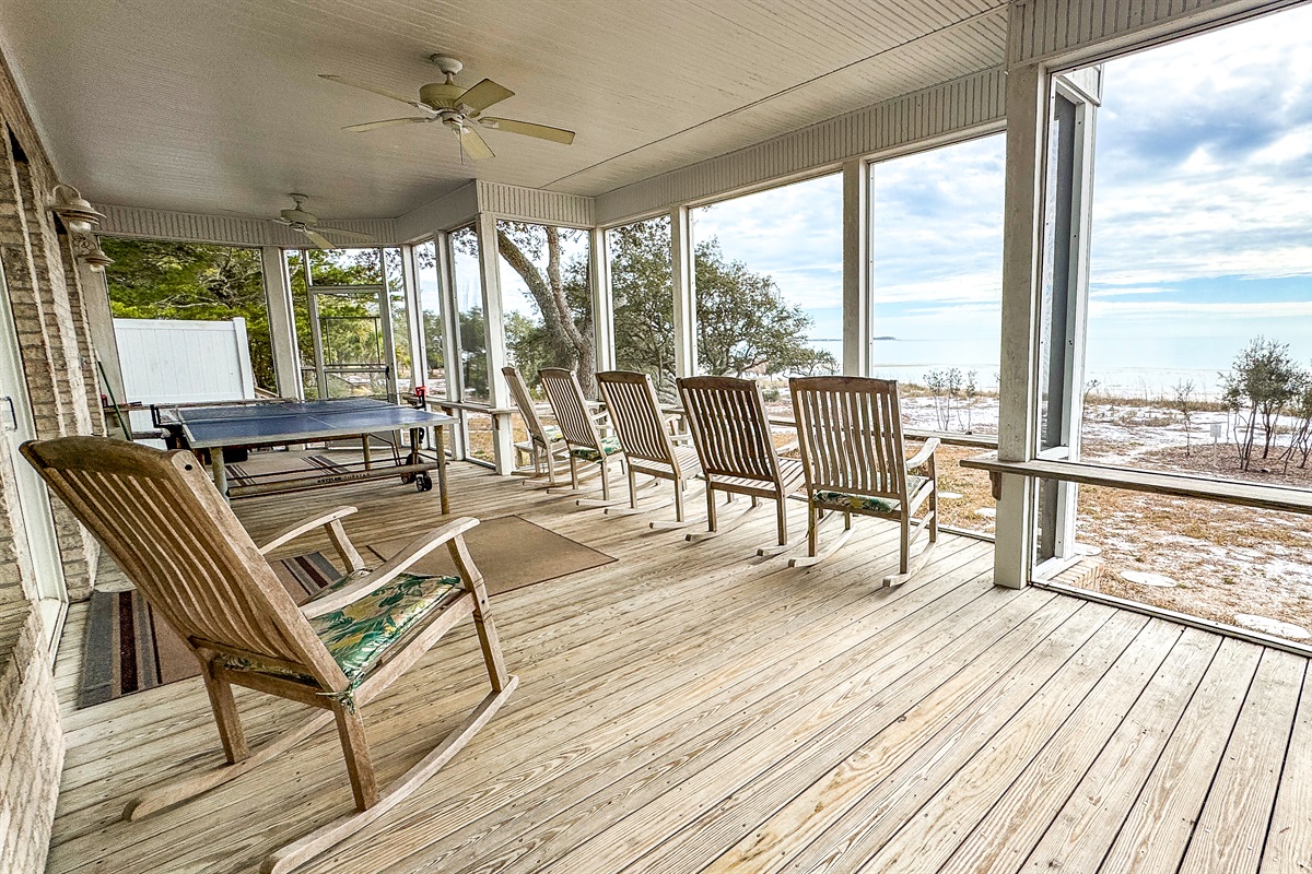 This is 1,300 sq. ft. It consists of a Kitchen (complete with range/oven, refrigerator, microwave, dishwasher, sink, dishes, utensils, etc.), Family Room with Eating Area, 3 Bedrooms, 2.5 Baths, Washer/Dryer, Outdoor Shower and large Screened in Porch with rocking chairs and ping pong table overlooking Beach/Gulf. The 3 Bedrooms on the First Floor include: (1) Master suite overlooking the Gulf with King Bed and Full Bath,, (2) Bedroom overlooking the Gulf with Queen Bed as well as Daybed with Trundle and Half Bath, and (3) Bedroom with Bunk Bed and Daybed with Trundle. A Full Bath is located next to the Bunk bedroom and the living area with access to outdoor shower. First floor has tile floors, area rugs and all the rooms except the Bunk Bed room have sliding glass doors opening to the 1st floor screened in porch and overlook the beach and Gulf.