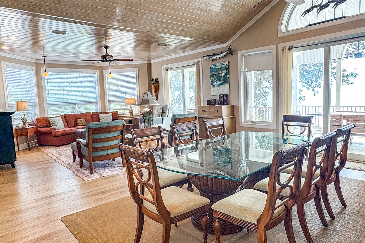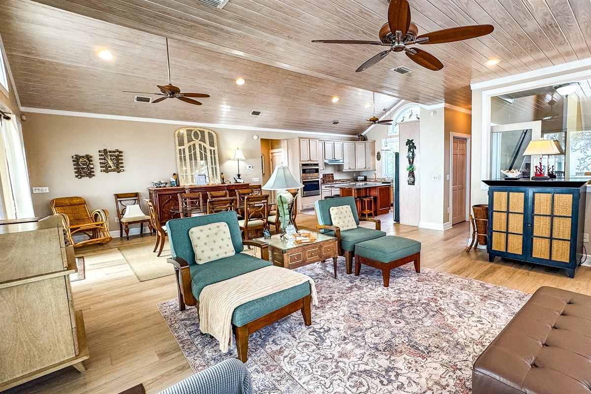 The 'Main Living Area' has Brazilian cherry floors, white-washed cathedral ceiling and exhibits an expansive open concept living area overlooking the Gulf with a fully equipped and well stocked (pots, pans, dishes, utilities, etc.) spacious Kitchen, Family Dining Area, Living Room, Half Bath with terracotta sink, large covered Cathedral Porch overlooking the Gulf with teak furnishings for outside viewing and dining. The kitchen has granite counter tops, stainless steel appliances, and a large central island with seating for five. The family dining table seats ten guests. The living room area has an oversize bay window with a custom couch and chairs. The second floor has the 4th Bedroom, a Master Suite which overlooks the Gulf with a King Bed, sitting area with couch, Full Bathroom with separate his and her vanities, enclosed toilet area, inside shower as well as a private outside shower with Gulf and Beach views. The open concept living/dining/kitchen area and the master suite all have stunning beach and Gulf front views with sliding glass doors that open directly onto the cathedral porch. There is an outside spiral staircase from the 2nd floor for direct beach access in addition to the inside access..