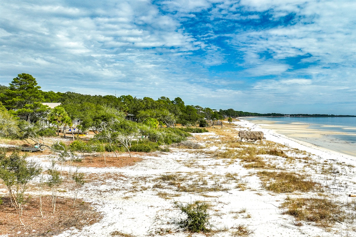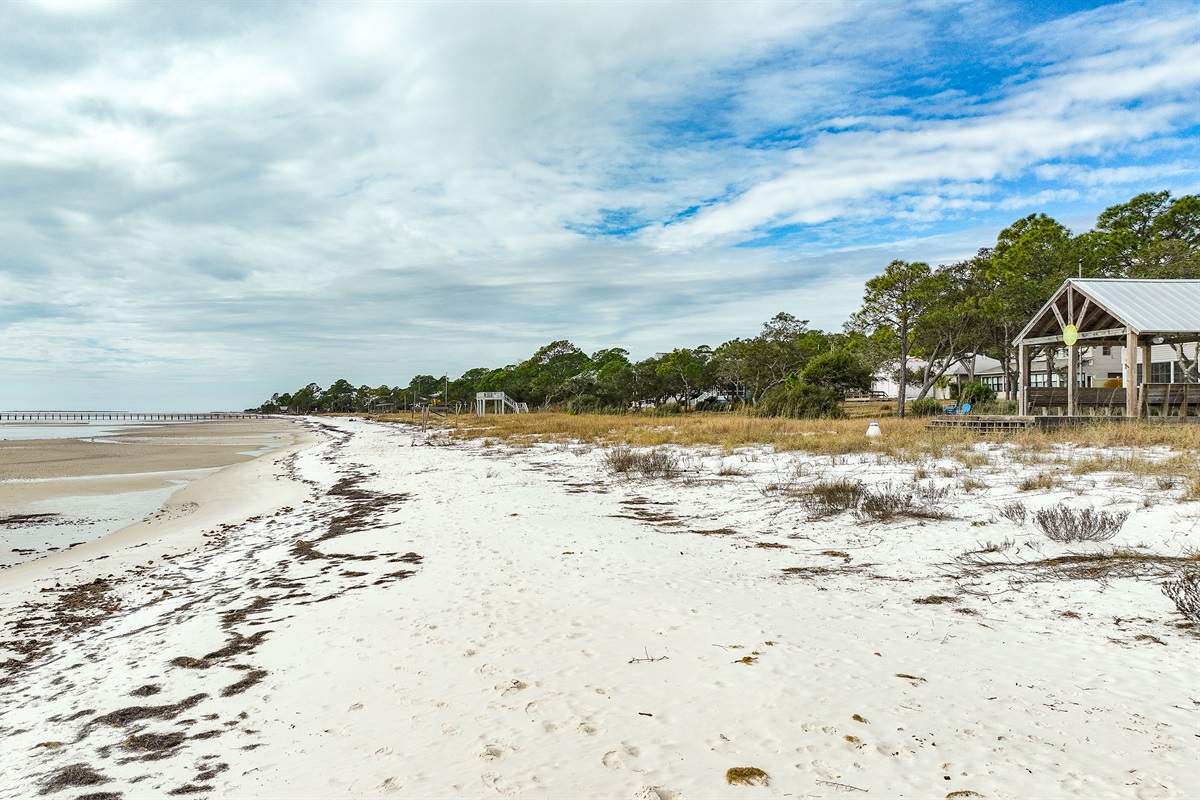 The beach has sugar white sand with Tides changing from low to high with gentle waves and no dangerous undertow. Low tide is especially perfect for younger children and provides sandbars for playful activity.
